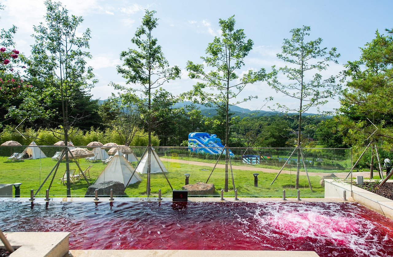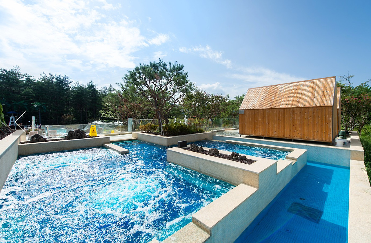 정원 속에서 노천욕을 즐길 수 있는 야외 스파로, 국내 최초로 불꽃분수와 함께 온천욕을 즐길 수 있습니다. 다섯 가지 시그니처 오색탕과 편백향이 짙은 건식사우나가 마련되어 있어 심신의 건강을 돕습니다.