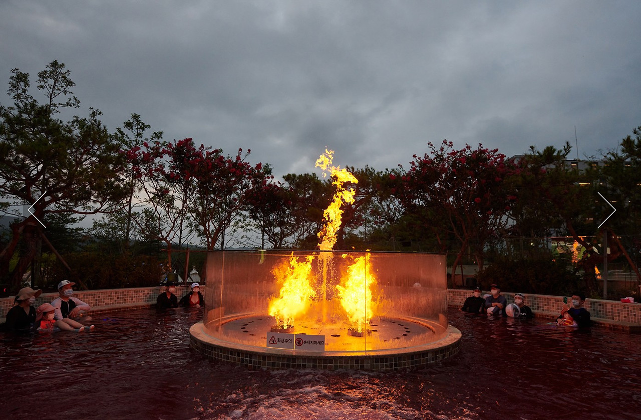 화염과 온천수가 함께 솟아오르는 국내 최초 불꽃분수 노천탕 불꽃쇼를