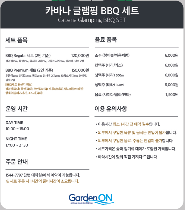 | 카바나 한타임 대여 + 가든온 2인 입장권 + 미니바 | 250,000원 |